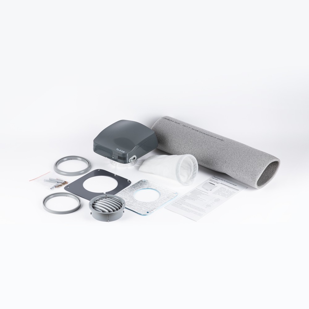 Клапан, Монтажная пластина, Прокладка теплоизолирующая, Комплект крепежа, фильтр F5, Руководство по эксплуатации, Труба из вспенинного полиэтилена 110*9, наружная решетка, декоративные кольца, стяжка нейлоновая
