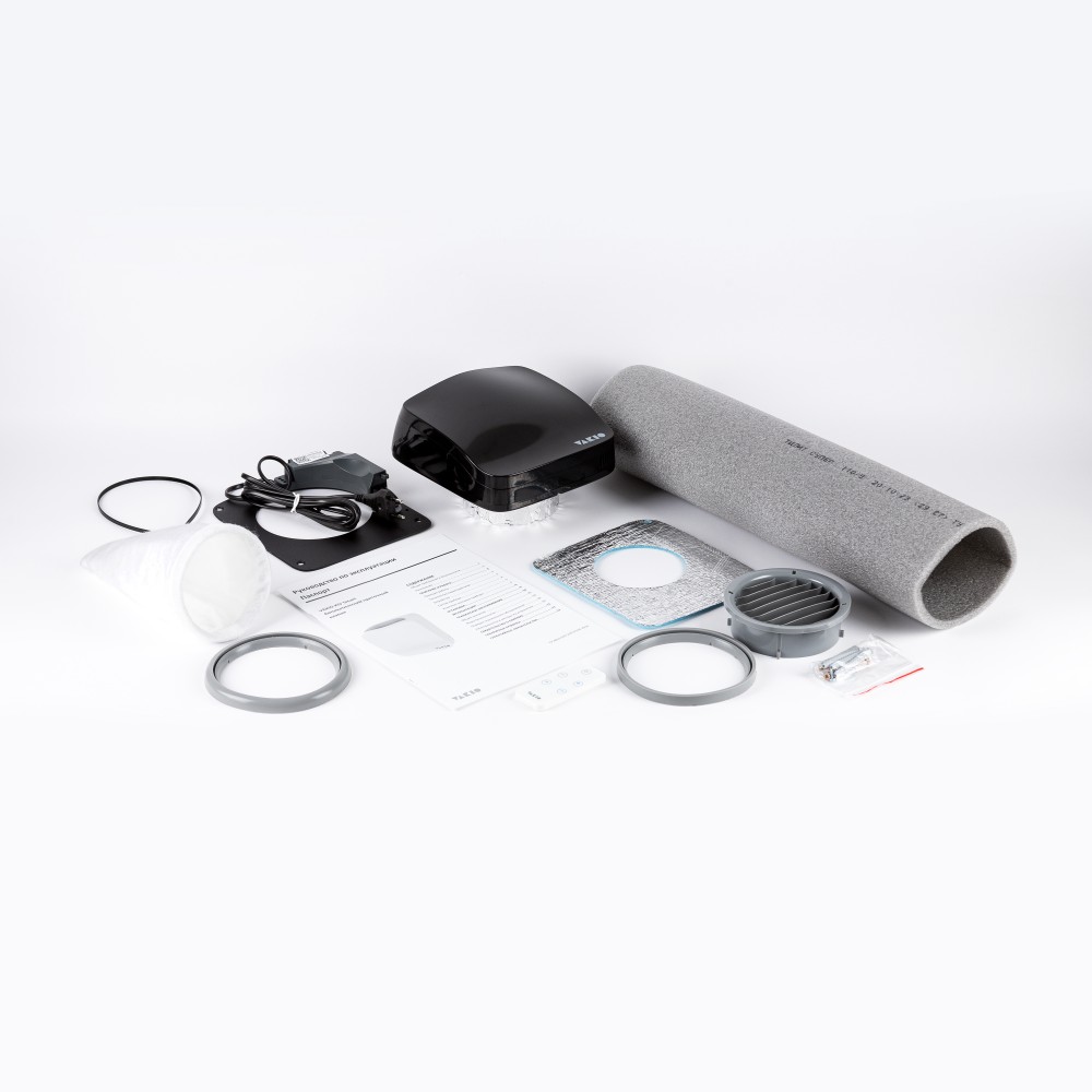 Прибор, Пульт ДУ, Фильттр класса F5, Монтажная пластина, Прокладка теплоизолирующая, Кабель питания, Комплект крепежа, Руководство по эксплуатации, Наружная решетка, теплоизоляция 110*9, Кабельная стяжка, Кольцо решетки без бортика, Кольцо решетки с бортиком
